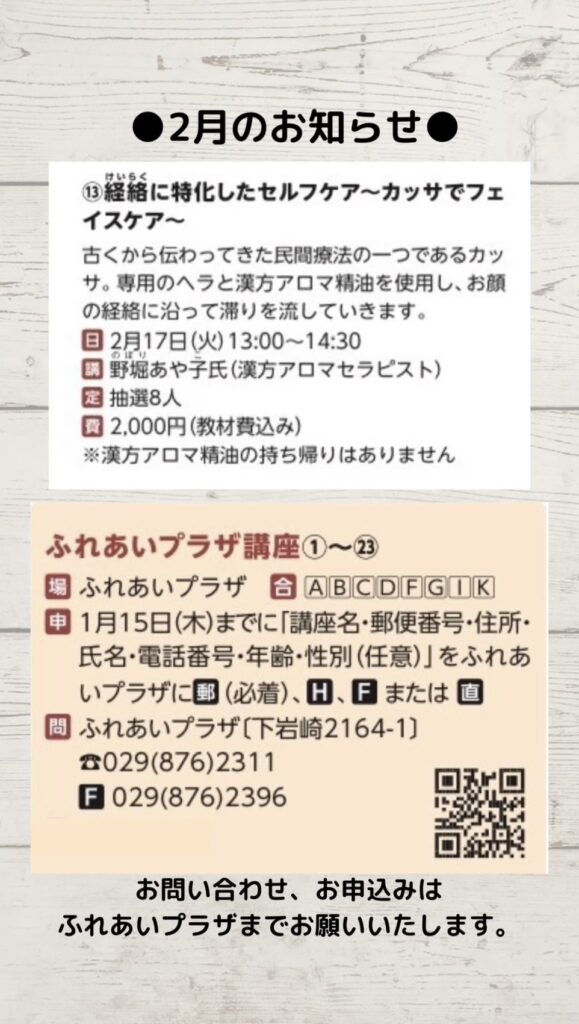 1月15日(木)までに「講座名・郵便番号・住所・氏名・電話番号・年齢・性別(任意)」をふれあいプラザに郵送(必着)、インターネット、FAXまたは直接お願いいたします。