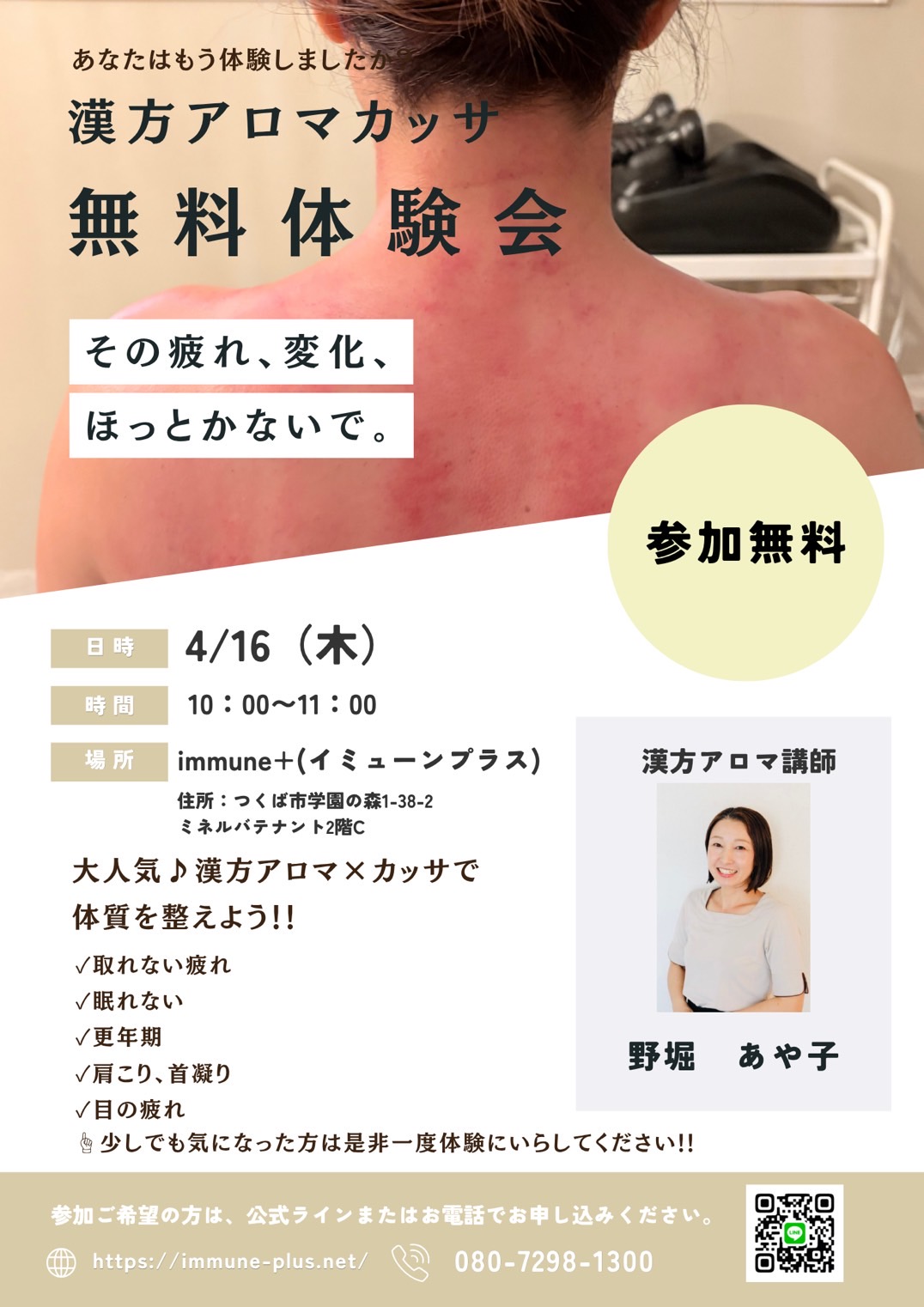 immune+では、毎月漢方アロマカッサ無料体験会を開催しています。