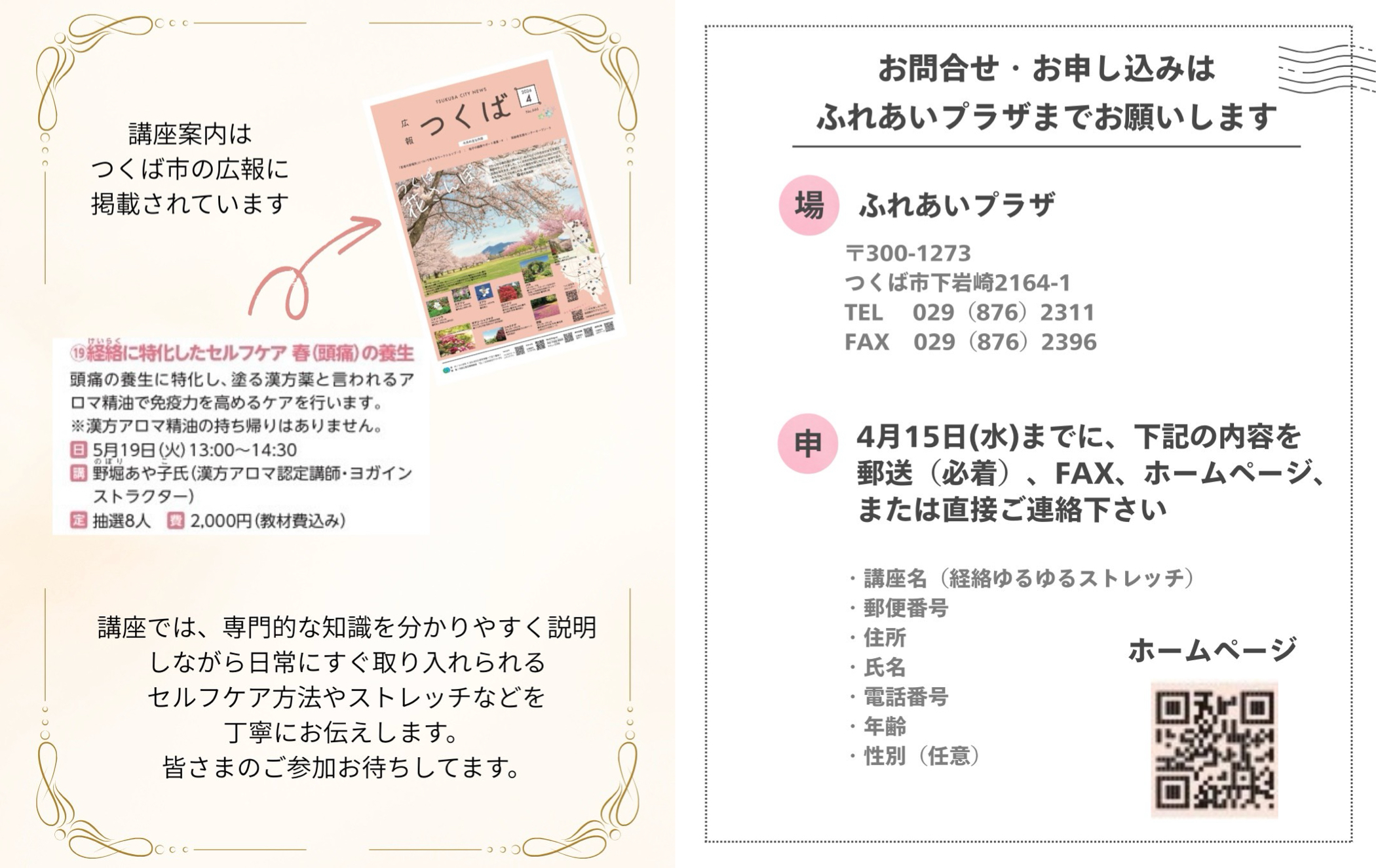 4月15日(水)までに「講座名・郵便番号・住所・氏名・電話番号・年齢・性別(任意)」をふれあいプラザに郵送(必着)、インターネット、FAXまたは直接お願いいたします。